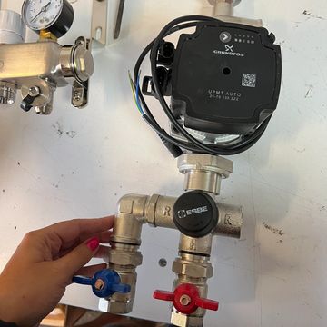 Isolation valves with gauges, Grundfos pump and thermostatic mixing set for Boiler fed systems.