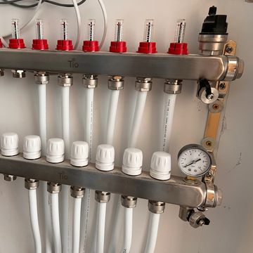 Preassembled manifold with Isolation valves with gauges, pressure gauge, automatic air vent and drain valves. Available from 2 Port manifolds to 12 Port manifolds.